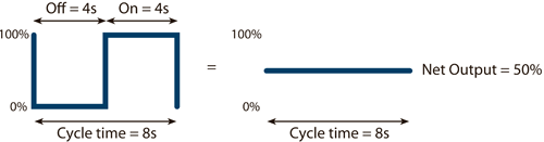 A time proportioned system uses a cycle time to proportion the output value. If the cycle time is set to 8 seconds, a system calling for 50% power will have the output on for 4 seconds and off for 4 seconds. As long as the power value doesn't change, the time values wouldn't change. Over time, the power is averaged to the 50% commanded value, half on and half off. If the output power needed to be 25%, then for the same 8 second cycle time, the output would be on for 2 seconds and off for 6 seconds.